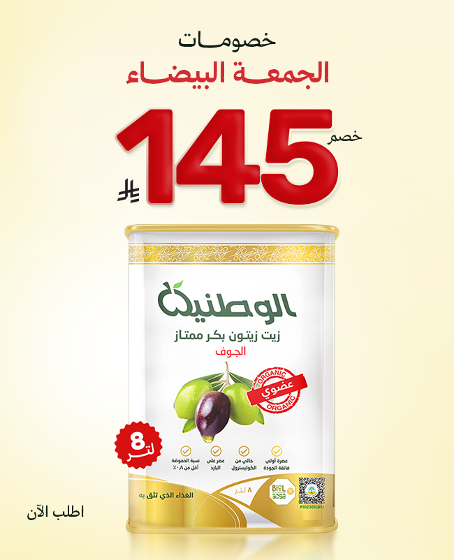 زيت زيتون الوطنية بحجم 8 لترزيت زيتون عضوي بكر ممتاز معصور من اجود حبات الزيتون المزروعة في مزارع عضوية تتبع أعلى معايير الجودة. يتميز هذا الزيت بنقائ..
